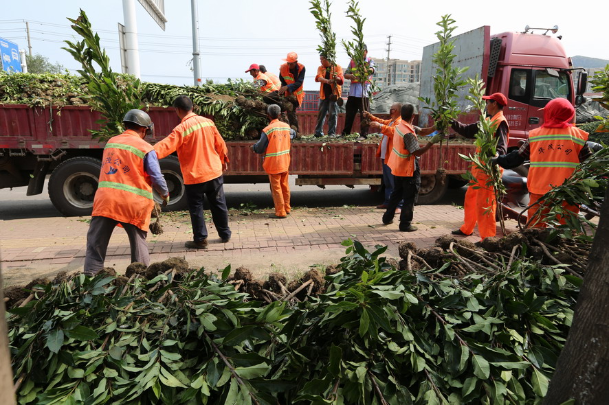 新光路鐵路橋至港城大道段南側(cè)綠化帶,因?yàn)槿藶椴忍?、車輛碾壓導(dǎo)致綠化斑禿損壞嚴(yán)重,為盡快恢復(fù)綠化原貌,改善市容市貌。818日,裕升、裕欣養(yǎng)護(hù)公司組織80多名綠化工,從早上6點(diǎn)一直干到下午6點(diǎn),卸苗、運(yùn)苗、挖坑、插苗,烈日酷暑下奮戰(zhàn)一整天,中午在樹陰下吃點(diǎn)盒飯,喝點(diǎn)礦泉水,繼續(xù)工作,橘黃色工作被汗水浸透、被烈日烤干,這樣有好幾個(gè)來回?!敖裉煳覀円谶@片綠化補(bǔ)植紅葉石楠、金森女貞等模紋小苗1萬余株,紅葉石楠球等灌木110株,有效改善該路段綠化植被,提升城市形象,我們還要在黃海續(xù)道補(bǔ)植草坪近30000平方,在這條1000多米長的路段,有車輛維修點(diǎn)50多家,車輛出入,對(duì)路邊綠化帶傷害非常大,這一路段也是環(huán)衛(wèi)整治長期存在的‘老大難’,這次,在開發(fā)區(qū)行政執(zhí)法部門的配合下,我們要重新種植草坪,對(duì)這一‘老大難’路段植被進(jìn)行恢復(fù),另外德蘭南路、東路補(bǔ)植苗木近80萬元的綠化工程也已開工上土整土,接著要栽苗,根據(jù)開發(fā)區(qū)創(chuàng)衛(wèi)部署要求,上述這些事情必須在8月底完成,所以說時(shí)間相當(dāng)緊,職工們都冒著高溫,加班加點(diǎn)搶進(jìn)度?!惫靖笨偨?jīng)理郁宏峰說。