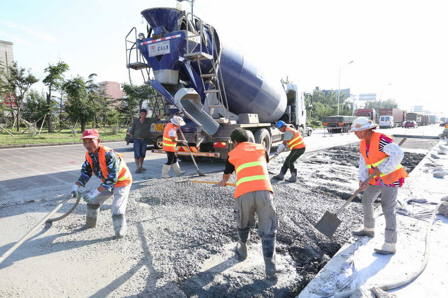在大港路“新光路至零公里”路段,筆者在水泥路上看到一塊塊被切割成方方正正的凹面,四周都架好防護(hù)欄等安全防護(hù)設(shè)施,在華東城北門偏東不遠(yuǎn)處,一臺(tái)挖掘機(jī)的鏟斗被換上沖擊破碎錘,正在一大塊破損的水泥路面沖擊破碎作業(yè),“嗒嗒嗒”的沖擊聲十分震耳。在與現(xiàn)場(chǎng)作業(yè)的盛達(dá)市政公司市政維修項(xiàng)目部副主任史如勤交流中得知,該路段是附近集團(tuán)箱基站進(jìn)出港口集裝箱車輛的重要通道,每天有好幾百輛集裝箱車輛進(jìn)出,水泥路面不堪重負(fù),損壞比較嚴(yán)重,根據(jù)開發(fā)區(qū)創(chuàng)衛(wèi)工作要求,由他們對(duì)該路段破損處進(jìn)行局面分割維修,整個(gè)路段維修面積達(dá)到5000多平方,為保證道路使用通行,采取半幅維修、邊破碎邊澆灌的方式,保證施工進(jìn)度,現(xiàn)正在維修北側(cè)路面,整個(gè)路面維修計(jì)劃在8月底完成?!耙?yàn)閯?chuàng)衛(wèi),我們下一步還要對(duì)轄區(qū)內(nèi)的破損、歪到的路牙石進(jìn)行維修扶正,242路段瀝青破損路面維護(hù),還要開通四處道口,而現(xiàn)在事多人少,人手比較緊張,我們周六周日都沒有休息,就是想把創(chuàng)衛(wèi)工作任務(wù)一項(xiàng)一項(xiàng)地及時(shí)完成,決不能拖創(chuàng)衛(wèi)工作后腿。”他邊說邊用肩上的毛巾擦著額頭上的汗水。