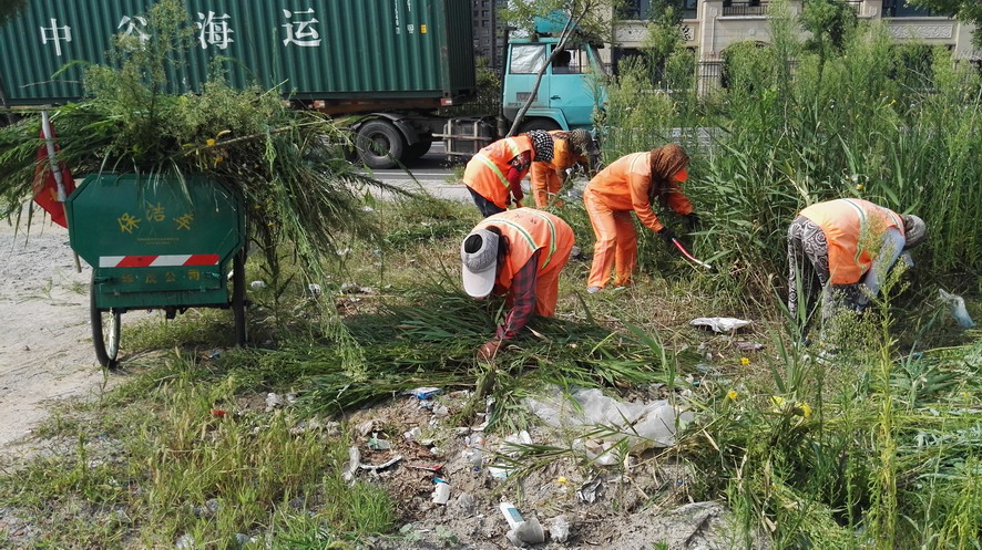在昌圩湖環(huán)湖路南側(cè)一處公共廁所處,裕升養(yǎng)護(hù)公司20多名環(huán)衛(wèi)保潔工人正在清理公廁周邊的雜草、建筑垃圾,有的在割草、有的在搬磚、有的在推車,一個(gè)個(gè)汗流浹背,忙得不亦樂乎。正在現(xiàn)場(chǎng)忙碌的保潔大隊(duì)長劉保軍對(duì)筆者說:“這一塊段還沒有交給我們養(yǎng)護(hù),一直無人管理,雜草叢生,成為建筑、裝修垃圾的堆放地,根據(jù)開發(fā)區(qū)創(chuàng)衛(wèi)環(huán)境衛(wèi)生無死角要求和華茂公司生產(chǎn)技術(shù)部門指令,我們?cè)IB(yǎng)護(hù)公司承擔(dān)這一區(qū)域環(huán)境衛(wèi)生突擊整治任務(wù),從綠化保潔班組抽調(diào)20多人來搞突擊,大家面對(duì)天氣炎熱、工作量大、清理困難等因素,發(fā)揚(yáng)不怕吃苦、敢打硬仗的華茂精神,奮戰(zhàn)在突擊現(xiàn)場(chǎng),每個(gè)人都汗流不止,工作服全被汗水浸透,昨天我們已在這里整整干了一天,由于垃圾量大、雜草面積大,我們動(dòng)用了裝載機(jī)等機(jī)械設(shè)備,運(yùn)雜草的三輪車跑近百趟,清理建筑、裝修等垃圾數(shù)十噸。估計(jì)今天下午能夠全部結(jié)束?!?/span>