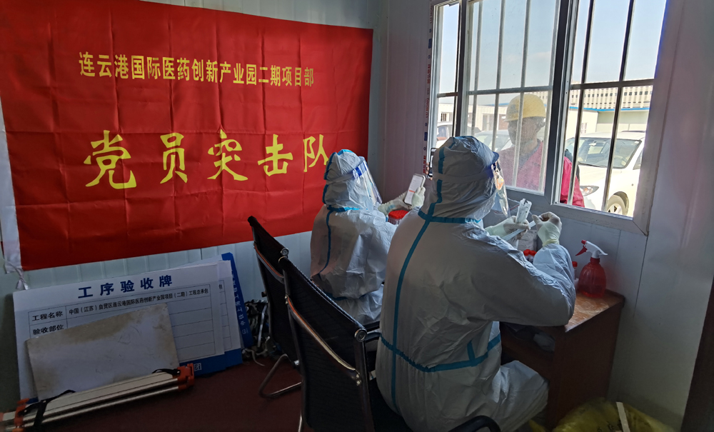 “請大家保持一米線,戴好口罩,有序參與核酸檢測,謝謝配合!”來自市級重大項(xiàng)目連云港國際醫(yī)藥創(chuàng)新產(chǎn)業(yè)園二期項(xiàng)目黨員突擊隊(duì)的成員席時棟、陳家輝喊道。據(jù)悉,該項(xiàng)目目前按照上級相關(guān)規(guī)定,實(shí)行閉環(huán)管理,做好相關(guān)疫情防控工作。“我們項(xiàng)目部嚴(yán)格按照市、開發(fā)區(qū)相關(guān)規(guī)定,做好閉環(huán)施工,疫情防控、項(xiàng)目建設(shè)兩手抓、兩手硬。”來自集團(tuán)棚戶區(qū)改造裕源三期項(xiàng)目負(fù)責(zé)人青年黨員徐震說道。
