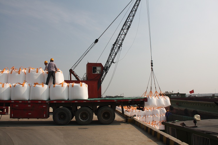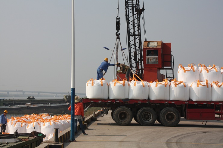 10月6日上午9時許,隨著一聲汽車長笛,一輛載有近40噸化工物資的卡車徐徐??吭谙笪锪鞴疚骞嗪哟a頭邊,緊接著碼頭鐵臂起舞,機械操作工宋成龍、楊棟梁嫻熟地操縱著塔吊機械,王緒銀、駱公友等職工敏捷地指揮吊臂準確地將一包包噸貸物資裝卸在碼頭邊的貨船中。。。。。。自此,一輛輛滿載噸袋物資的卡車便不停地駛進碼頭。