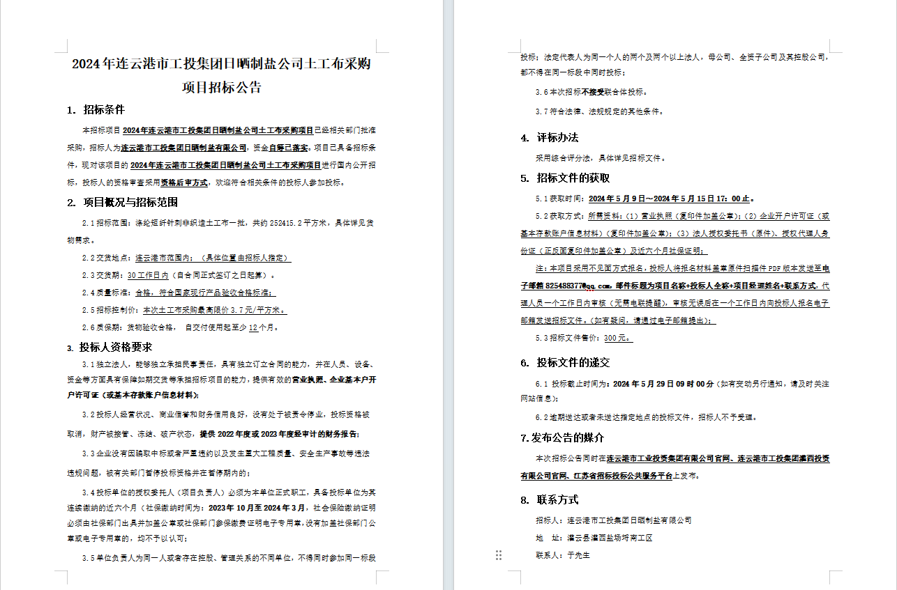 2024年連云港市工投集團日曬制鹽公司土工布采購項目招標公告
