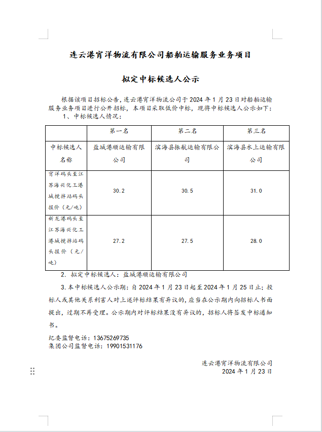 連云港宵洋物流有限公司船舶運輸服務(wù)業(yè)務(wù)項目擬定中標候選人公示