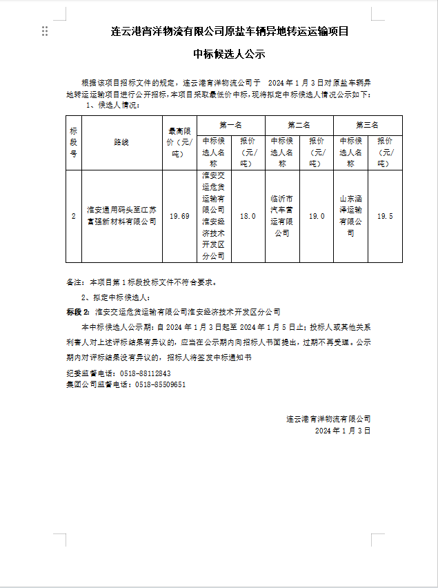 連云港宵洋物流有限公司原鹽車輛異地轉(zhuǎn)運(yùn)運(yùn)輸項(xiàng)目中標(biāo)候選人公示