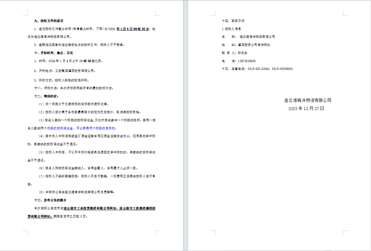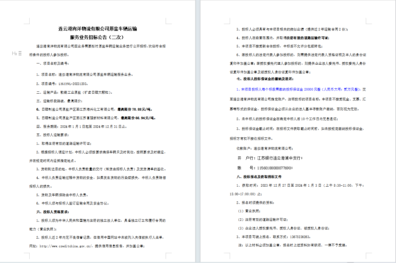 連云港宵洋物流有限公司原鹽車輛運(yùn)輸服務(wù)業(yè)務(wù)招標(biāo)公告(二次)