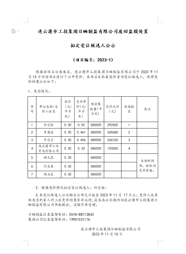 連云港市工投集團日曬制鹽有限公司廢舊鹽膜處置擬定受讓候選人公示