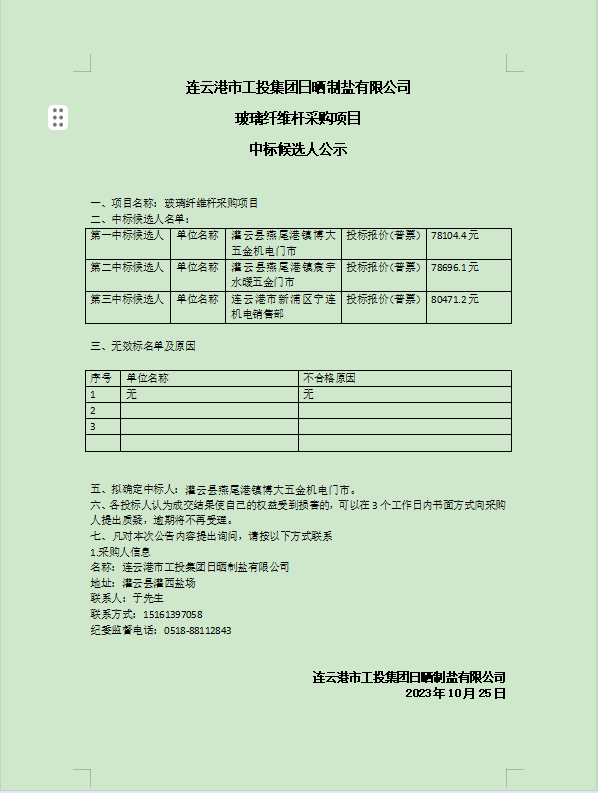 連云港市工投集團(tuán)日曬制鹽有限公司玻璃纖維桿采購項(xiàng)目中標(biāo)候選人公示