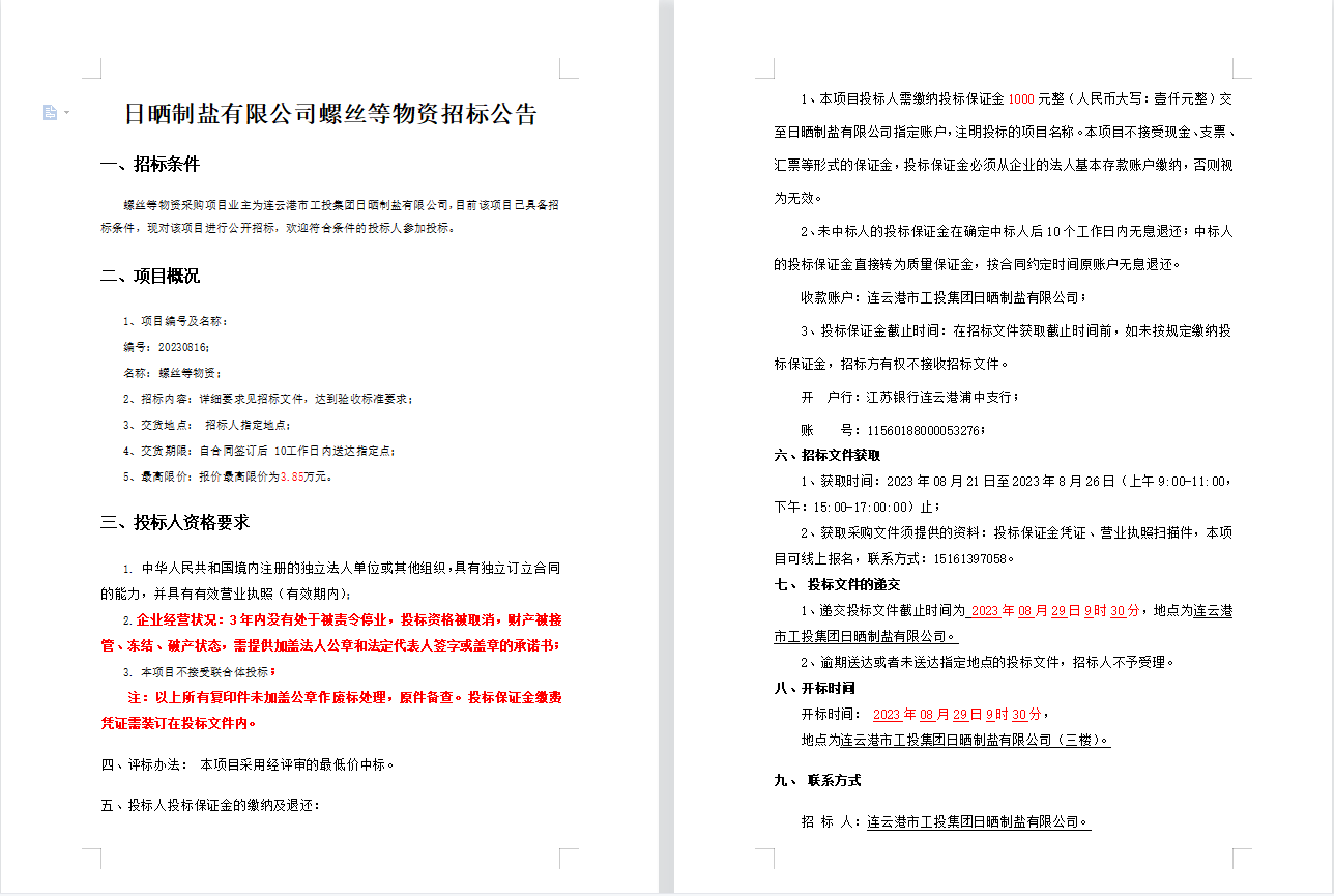 日曬制鹽有限公司螺絲等物資招標公告