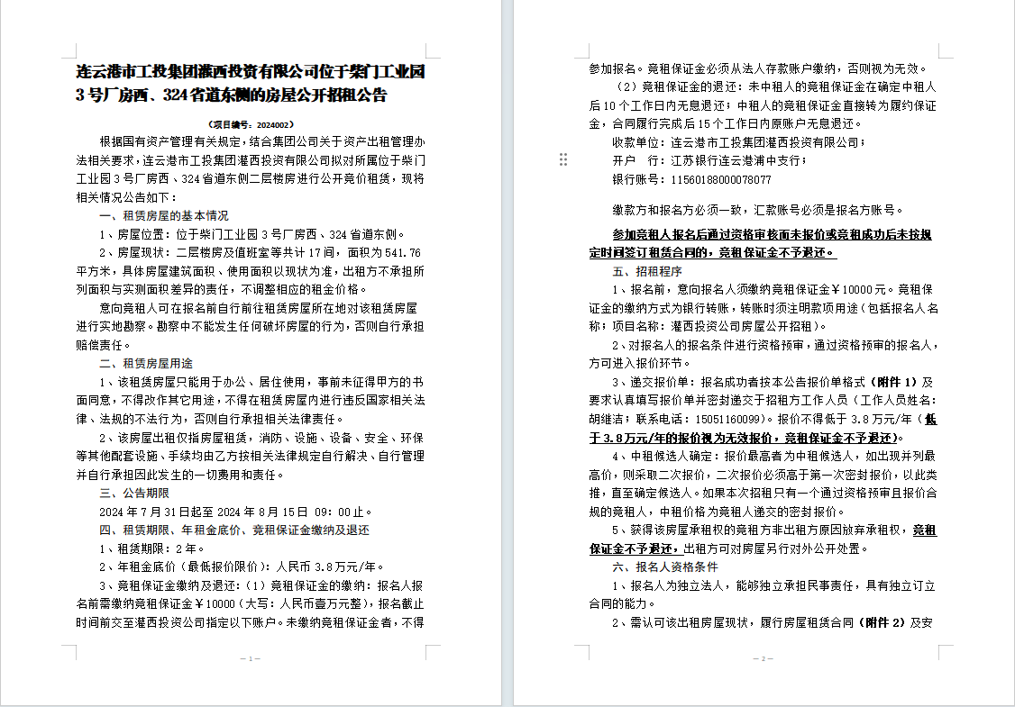 連云港市工投集團(tuán)灌西投資有限公司位于柴門工業(yè)園3號廠房西、324省道東側(cè)的房屋公開招租公告