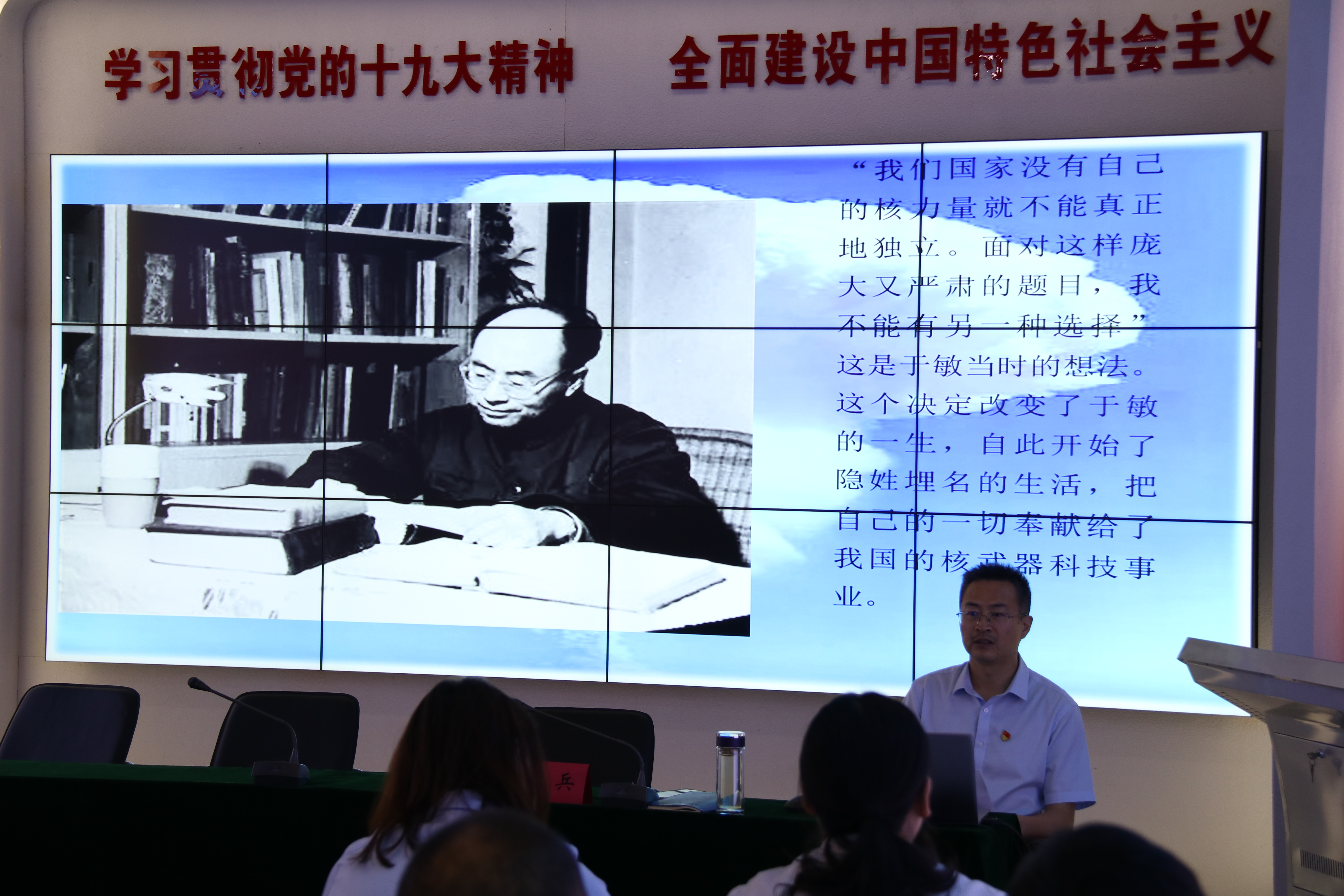 徐兵從六個方面詳細講解了“兩彈一星”功勛獎章、國家最高科學技術獎獲得者,國防科技事業(yè)改革發(fā)展的重要推動者,于敏同志“肩負重任,祖國的需要高于一切”的傳奇事跡。號召全體黨員職工學習于敏堅持絕對忠誠的政治品格。在火熱的陽光下,在鮮艷的黨旗前,在茫茫的戈壁灘上,于敏同志無愧于“共和國鑄劍師”,其“錚錚鐵骨”精神更是我們每一位黨員干部學習的楷模。學習于敏堅持高度自覺的大局意識,幾十年來舍小家、顧大家,為了國家核事業(yè)發(fā)展的大局毅然選擇對家人“隱身”、對社會隱姓埋名。于敏同志這面旗幟,映射出一個信念:用一輩子,做一件有意義的事!
