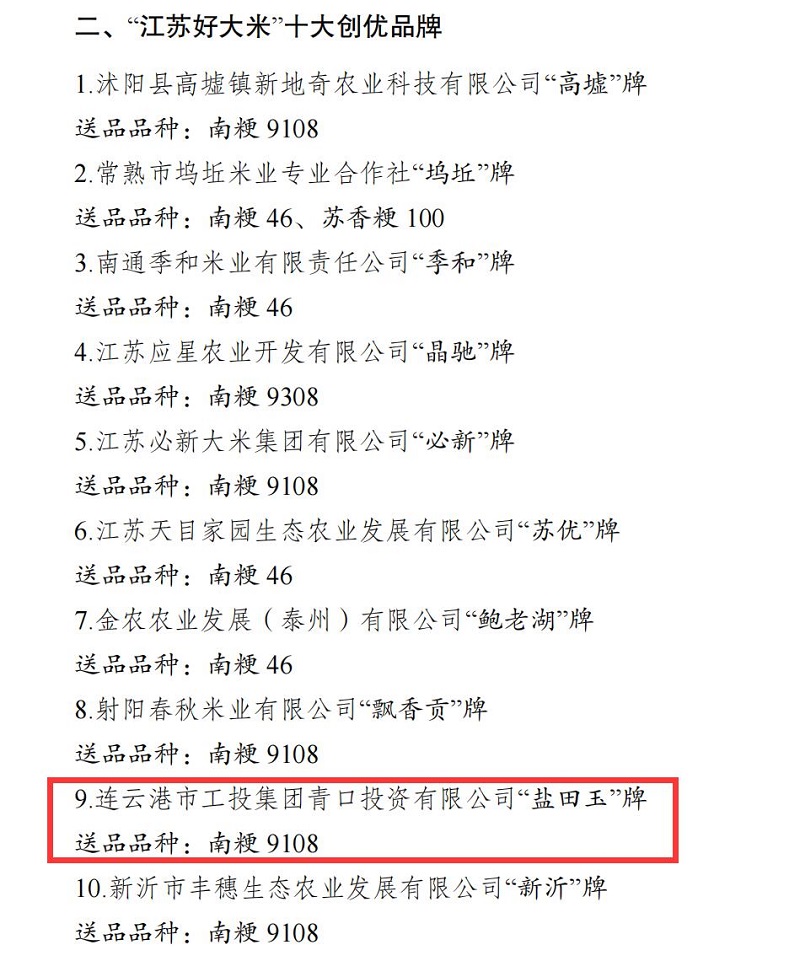 近日,第八屆江蘇好大米評鑒推介結(jié)果公布“鹽田玉”品牌再創(chuàng)佳績,榮獲“江蘇好大米”十大創(chuàng)優(yōu)品牌。