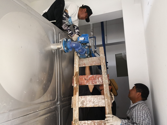 搶修現(xiàn)場,工作人員經(jīng)過仔細(xì)勘察,并通過自動供水配電柜的各項數(shù)據(jù)逐一排查,最終確定為進水水力閥銹蝕損壞,失去水箱滿水時自動停水的功能,造成水箱溢水現(xiàn)象發(fā)生。由于泵房內(nèi)維修空間狹小,操作有一定難度,為了保證居民生活用水不受影響,自來水班組 想方設(shè)法,一方面安排專職人員現(xiàn)場監(jiān)督安全,另一方面,安排熟練的操作工 在狹小的空間里半蹲著操作維修,甚至 還要進入水箱內(nèi)更換配件,拆除壞閥門、連接管道、加裝防漏水皮墊、擰緊螺絲等多道工序順利完成 。經(jīng)過近 3小時的奮力苦干,終于搶修完畢,恢復(fù)正常供水,有力的保證了小區(qū)居民的生活用水。 (張根玲)