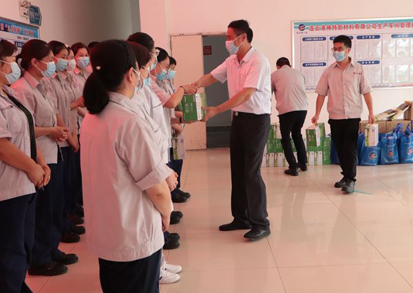 陳總向高溫下堅(jiān)守崗位的一線職工進(jìn)行慰問,細(xì)心叮囑要認(rèn)真做好防暑降溫和疫情防控工作,并送上綠豆、大米等防暑降溫慰問品,為在炎炎夏日?qǐng)?jiān)守一線的職工送來一份清涼,帶來一片關(guān)懷。(神特宣)