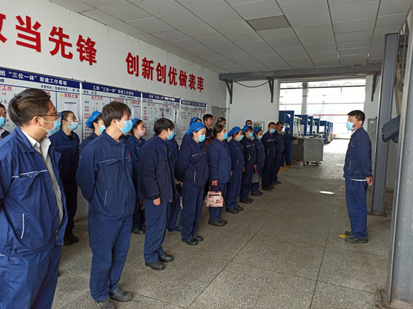 為加強(qiáng)規(guī)范化管理,近日,公司制定生產(chǎn)班組班會(huì)開會(huì)流程,規(guī)定班組員工按指定區(qū)域點(diǎn)位有序站好、著裝整齊、動(dòng)作劃一。通過該項(xiàng)措施,有效改善生產(chǎn)班組員工開會(huì)時(shí)“松、散、懶”形象,提起振奮,提勁實(shí)干。