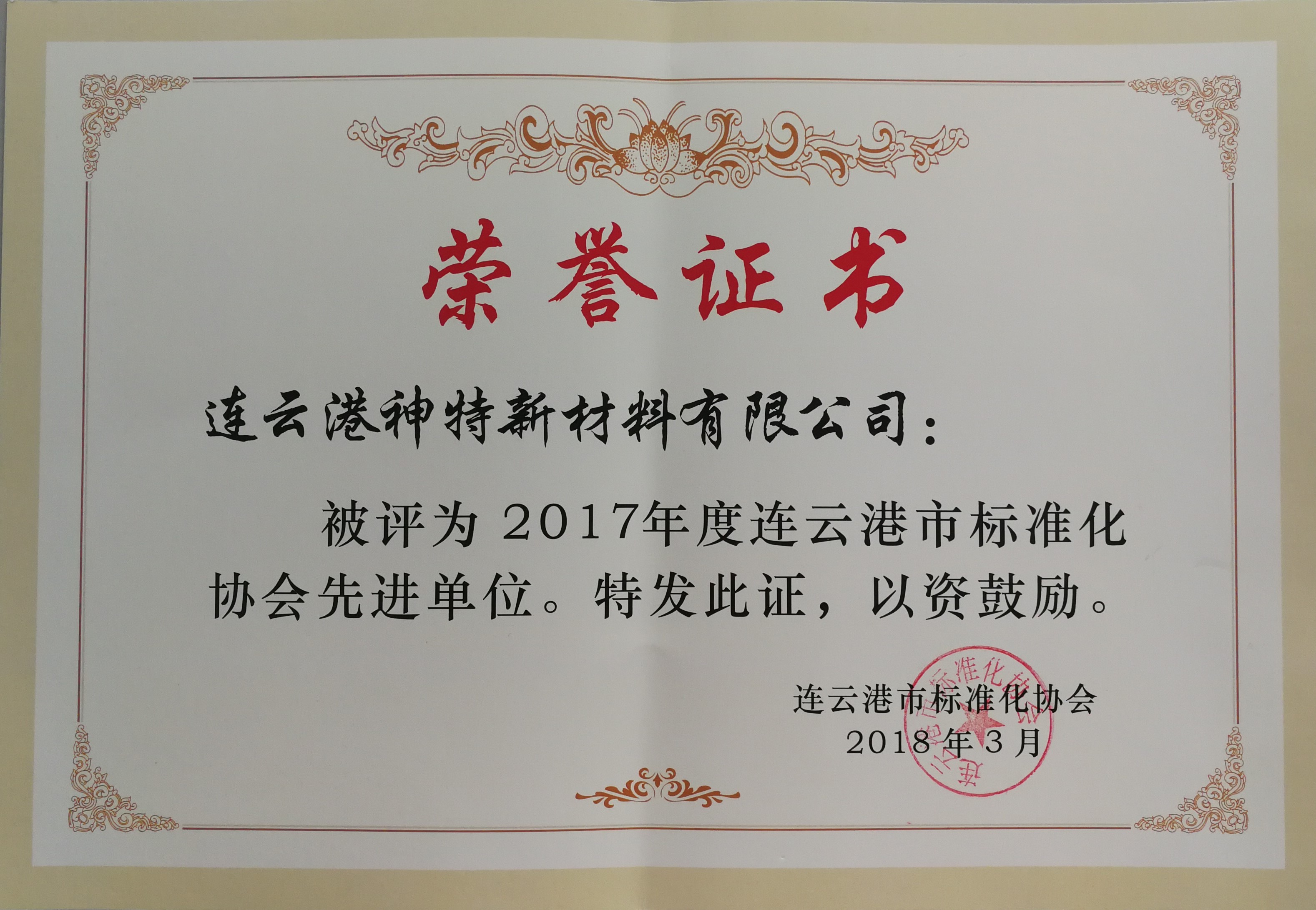 4月2日,神特公司參加由市標(biāo)準(zhǔn)化協(xié)會組織的2018年會員大會,被批準(zhǔn)為連云港市標(biāo)準(zhǔn)化協(xié)會團體會員單位,并被評為2017年度連云港市標(biāo)準(zhǔn)化協(xié)會先進單位。