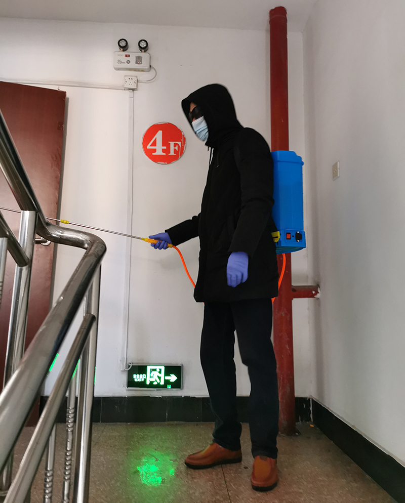 義務(wù)消毒,沒有報(bào)酬,得隨時(shí)待命,看起來是應(yīng)者寥寥的苦差。在昌圩湖職工小區(qū)和公司機(jī)關(guān)大樓,卻穿梭著這樣的身影。他們背著裝滿消毒液的噴壺,穿梭在社區(qū)街道和辦公場(chǎng)所,把消毒液噴灑的每一處