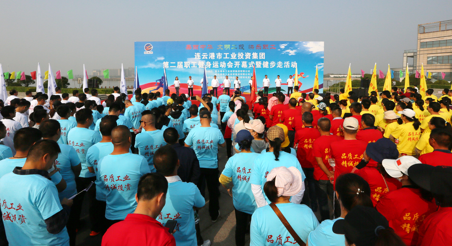 金秋十月,丹桂飄香。10月24日上午,美麗的徐圩新區(qū)云湖廣場彩旗招展,歌聲飛揚(yáng),為慶祝中華人民共和國成立70周年,豐富職工業(yè)余文化生活,由集團(tuán)公司、集團(tuán)公司工會(huì)主辦,徐圩投資公司承辦的集團(tuán)第二屆職工健身運(yùn)動(dòng)會(huì)開幕式暨健步走活動(dòng)在這里隆重舉行。集團(tuán)公司黨委書記、董事長楊龍宣布第二屆職工健身運(yùn)動(dòng)會(huì)開幕,并為健步走活動(dòng)發(fā)令??偨?jīng)理胡建明致開幕詞。工會(huì)主席劉承志主持開幕式。 本次運(yùn)動(dòng)會(huì)圍繞“美麗中華·文明工投·快樂職工”活動(dòng)主題,來自全公司各條戰(zhàn)線的17支代表隊(duì)1200多人次的運(yùn)動(dòng)員參加拔河、跳繩、乒乓球、健步走等項(xiàng)目的角逐。他們以勇奪第一、超越自我的競賽精神和攜手奮進(jìn)、合力拼搏的競賽風(fēng)尚,充分展示工投人追求卓越、共建和諧的優(yōu)秀精神風(fēng)貌。本次運(yùn)動(dòng)會(huì)將對(duì)個(gè)人單項(xiàng)比賽前六名、集體項(xiàng)目比賽前三名及道德風(fēng)尚獎(jiǎng)獲得者給予表彰。