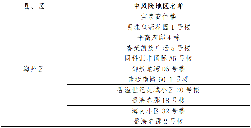 海州區(qū)同科匯豐國際C10號樓、紫金公館3號樓、興業(yè)時代花園B6號樓、興業(yè)時代花園C6號樓、九龍城市樂園77號樓、明珠皇冠花園20號樓、華潤公寓、雙龍村澗西隊65號、眾興華庭10號樓、壹品國際C區(qū)、香溢世紀(jì)花城小區(qū)2號樓、明珠皇冠花園11號樓、小學(xué)路11-1號樓、兆隆城市洋房A號樓、振興小區(qū)2號樓、易居公館4號樓、浦潤花園4號樓由中風(fēng)險地區(qū)調(diào)整為低風(fēng)險地區(qū)。