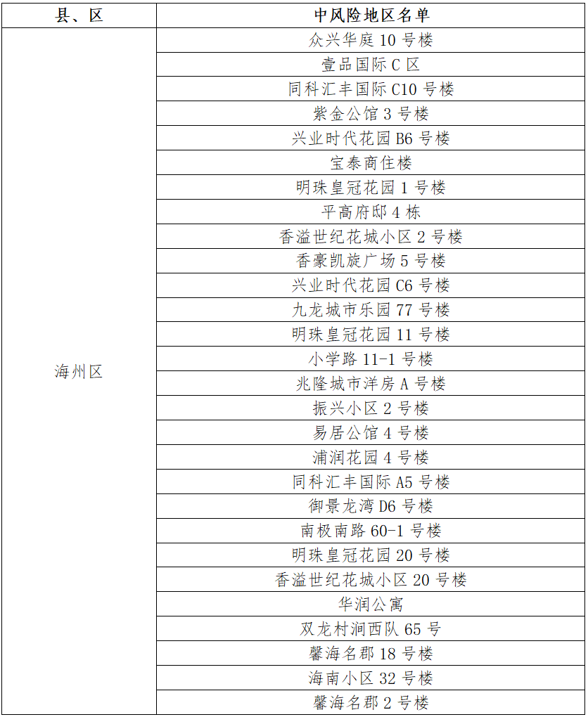 根據(jù)國(guó)務(wù)院聯(lián)防聯(lián)控機(jī)制有關(guān)規(guī)定,經(jīng)市指揮部研究決定,自發(fā)布之日起,對(duì)我市部分區(qū)域疫情風(fēng)險(xiǎn)等級(jí)進(jìn)行調(diào)整:海州區(qū)天順國(guó)際花園7號(hào)樓、鳳凰名都10號(hào)樓、御景龍灣C1號(hào)樓、天順國(guó)際花園11號(hào)樓、御景龍灣A4號(hào)樓、香溢江南小區(qū)12號(hào)樓、同科匯豐國(guó)際A2號(hào)樓、平高書(shū)香名邸1號(hào)樓、香溢江南小區(qū)7號(hào)樓、西門村楊鳳莊21號(hào)、鳳凰名都9號(hào)樓、園林村白虎山小區(qū)78號(hào)樓、江化北路82-5號(hào)、金色大漠、平高書(shū)香名邸4號(hào)樓、朐陽(yáng)街道花園路1號(hào)、制藥巷5-114、萬(wàn)潤(rùn)泰和苑4號(hào)樓由中風(fēng)險(xiǎn)地區(qū)調(diào)整為低風(fēng)險(xiǎn)地區(qū)。其他地區(qū)風(fēng)險(xiǎn)等級(jí)不變。調(diào)整后全市現(xiàn)有28個(gè)中風(fēng)險(xiǎn)地區(qū)。