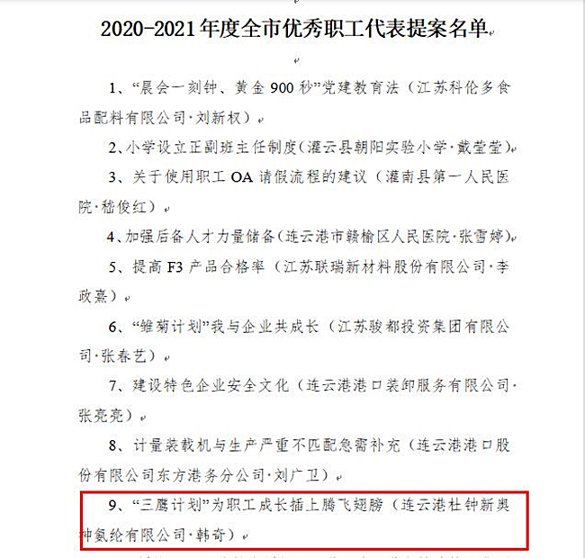杜鐘氨綸公司榮獲全市優(yōu)秀職工代表提案
