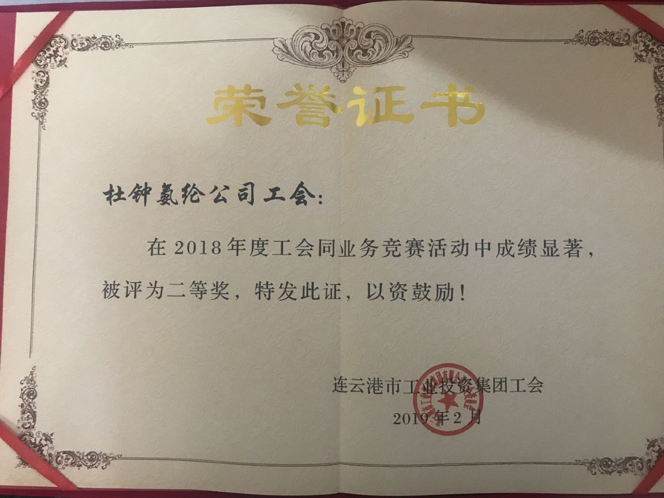 氨綸公司工會(huì)榮獲2018年度集團(tuán)工會(huì)同業(yè)務(wù)競(jìng)賽二等獎(jiǎng)