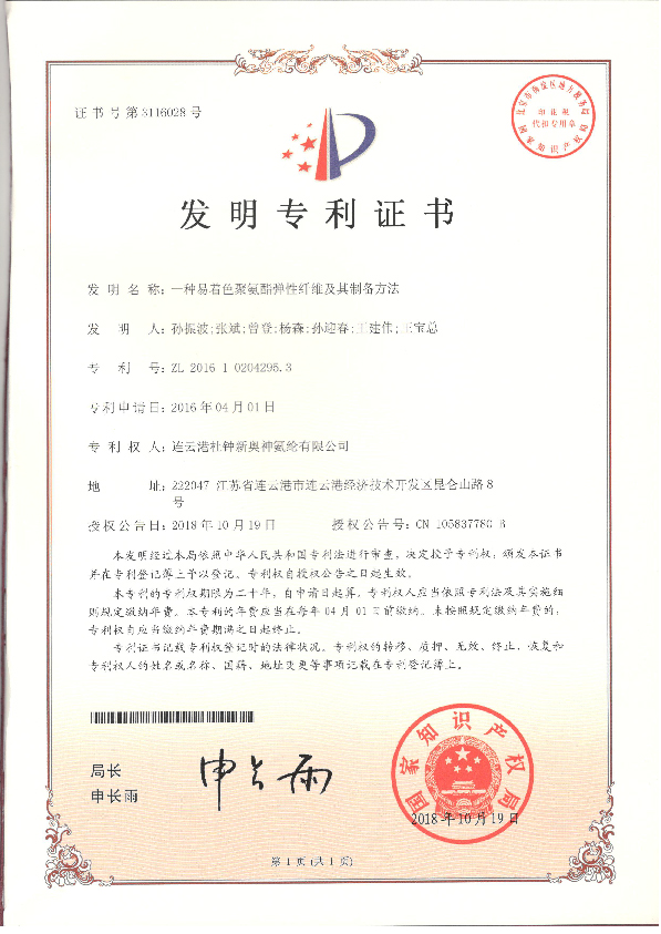 近日,從國家知識(shí)產(chǎn)權(quán)局傳來喜訊,連云港杜鐘新奧神氨綸有限公司申報(bào)的“一種易著色聚氨酯彈性纖維及其制備方法”專利獲得國家發(fā)明專利授權(quán)。