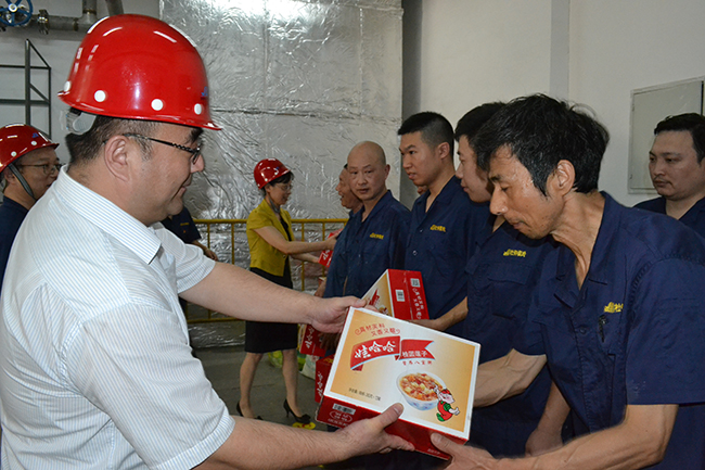 717日上午,集團(tuán)公司董事長(zhǎng)楊龍、紀(jì)委書(shū)記汪群一行來(lái)氨綸公司慰問(wèn)奮戰(zhàn)在高溫下的一線員工,為他們送去綠豆、牛奶、八寶粥、解暑藥等防暑降溫慰問(wèn)品。在詳細(xì)詢問(wèn)了防暑降溫各項(xiàng)保障工作的落實(shí)情況后,楊龍董事長(zhǎng)叮囑大家要合理安排工作時(shí)間,避開(kāi)高溫時(shí)段,確保身體健康和安全生產(chǎn)。氨綸公司總經(jīng)理張斌、副書(shū)記王克平陪同慰問(wèn)。