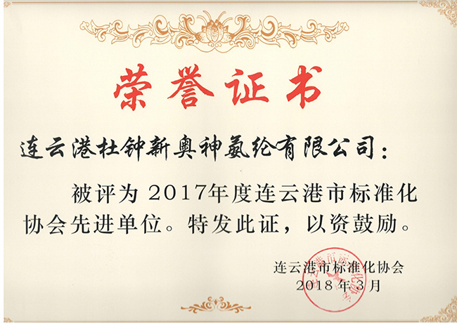 氨綸公司榮獲“2017年度連云港市標(biāo)準(zhǔn)化協(xié)會先進(jìn)單位”榮譽(yù)稱號