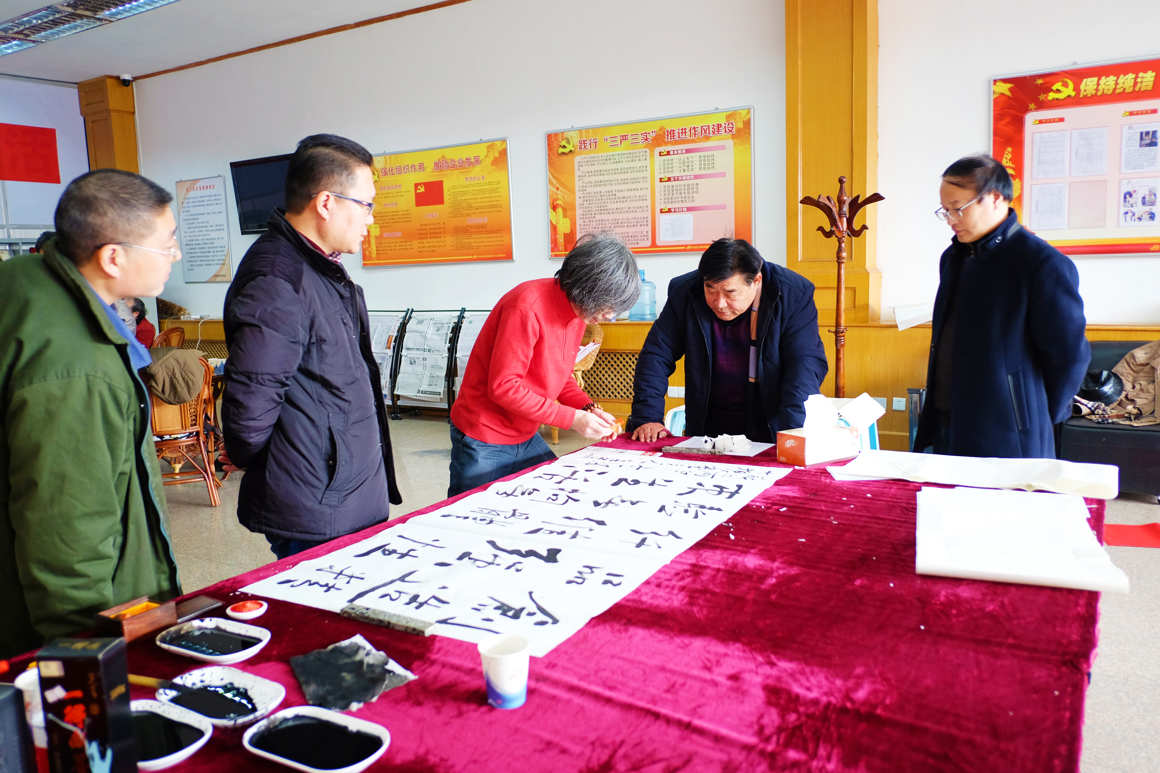 元旦、春節(jié)將至,為營(yíng)造和諧喜慶的節(jié)日氣氛,不斷提升企業(yè)文化品位氛圍,1230日,海州區(qū)美術(shù)協(xié)會(huì)7位書(shū)畫(huà)大師受邀赴我公司潑墨獻(xiàn)寶。我司幾位書(shū)法愛(ài)好者也同場(chǎng)競(jìng)技學(xué)習(xí),豐富了員工的文化生活。