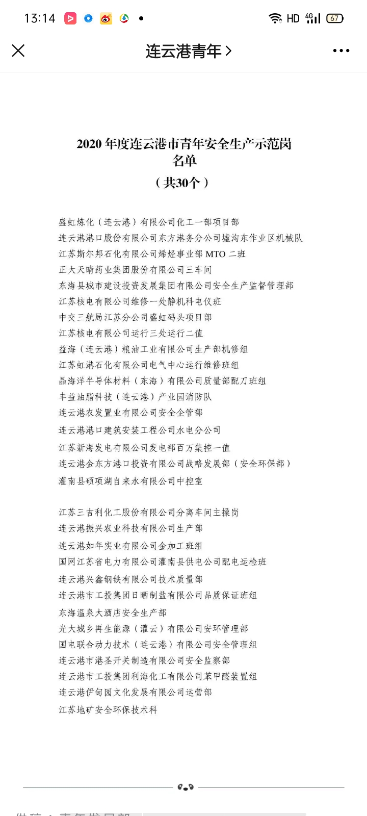 1112,共青團(tuán)連云港市委員會(huì)公布2020年度連云港市青年安全生產(chǎn)示范崗名單,連云港市工投集團(tuán)日曬制鹽公司品質(zhì)保證班組被評(píng)為2020年度連云港市青年安全生產(chǎn)示范崗。