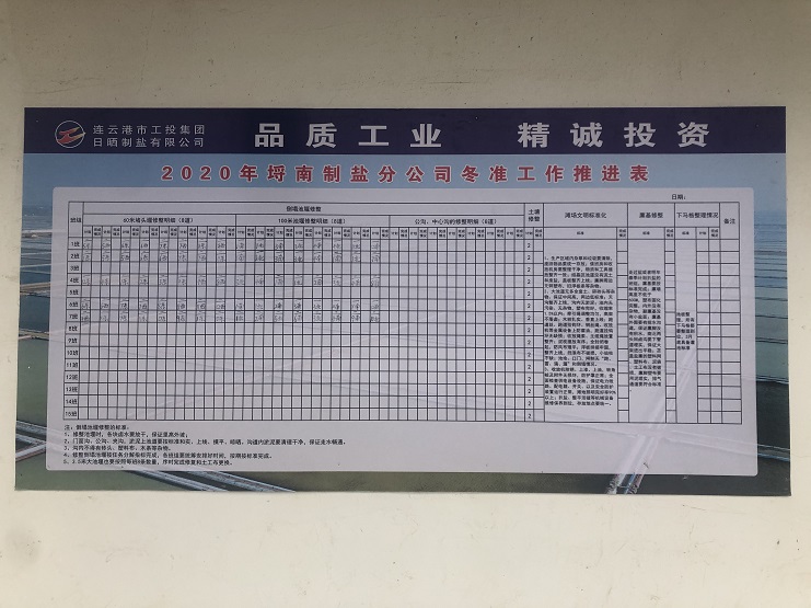 為更好落實“冬準”大會會議精神,11月17日上午,埒南制鹽公司制定冬準工作推進表,張貼在公司辦公區(qū)域墻面上,促進冬準工作有序開展。