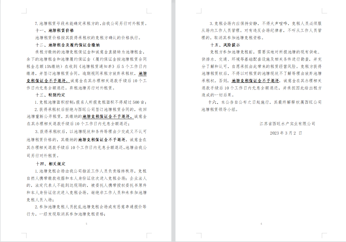 江蘇省西旺水產(chǎn)實(shí)業(yè)有限公司2023年度淡水養(yǎng)殖池塘公開(kāi)競(jìng)租公告