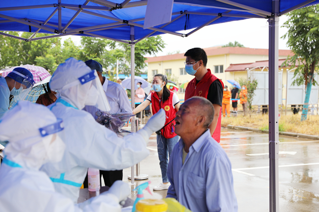 “黨旗飄在一線、堡壘筑在一線、黨員沖在一線”。核酸檢測現(xiàn)場,來自青口公司黨員志愿者在現(xiàn)場為職工群眾提供相關(guān)咨詢和掃碼指導(dǎo)服務(wù),很多黨員在核檢工作中全身濕透仍在雨中盡力維護(hù)秩序,盡管天氣不作美,但是職工群眾依然按工作人員的指導(dǎo)有序地進(jìn)行核酸檢測。大雨里,黨員紅、醫(yī)護(hù)白顯得格外耀眼。(仲偉彬)