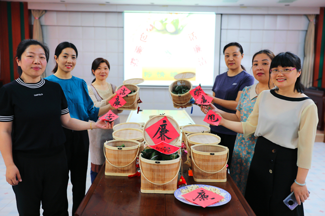 在活動現(xiàn)場,桌子上擺滿了碧青粽葉、黑白糯米、紅豆大棗、白色蓮子,烘托出濃厚的節(jié)日氣氛。大家歡聚一堂、歡聲笑語,在傳統(tǒng)文化中感受廉潔元素,一邊聊著家常,一邊包著粽子,先是選好“青”廉衣,然后放入提前泡好的 “蓮”心餡,最后系緊“廉潔繩”,不一會,一個個碧綠飄香、形狀各異“廉心粽”就包好了,被整齊地擺放在竹籃中。紀(jì)委書記朱文兵說:“廉心粽蘊(yùn)含著清正廉潔的美好寓意,組織大家親手包廉粽,是希望大家能夠把‘廉’帶回家,在品嘗美味廉粽的同時,還要時刻繃緊廉潔弦,做到守廉潔、過廉節(jié)”。