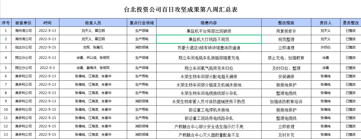 臺北投資公司百日攻堅(jiān)成果第八周匯總表