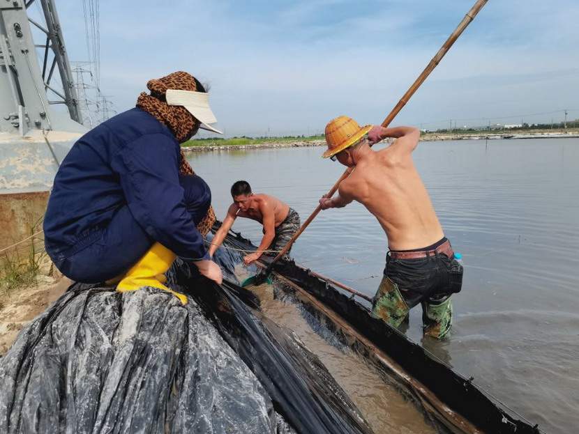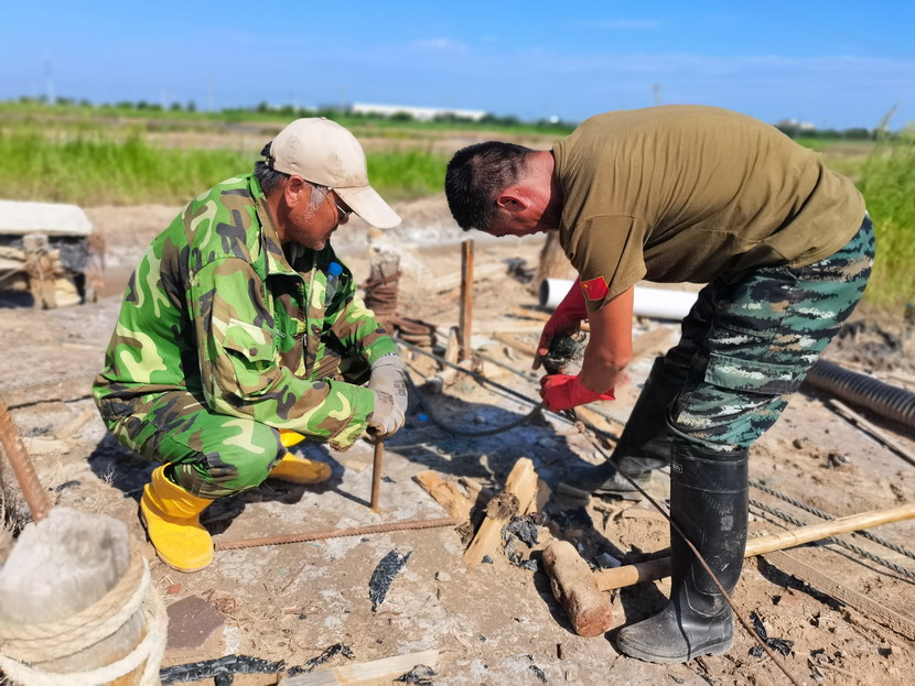 來到海州灣公司灘頭,遠(yuǎn)遠(yuǎn)望見幾名職工在鹽池里勞作,走近一看,組長夏軍正帶領(lǐng)一組人整修塑苫池。“我們5點(diǎn)就出來了,趁早涼,趕緊把塑料布整理一下,布子上都是鹵,長了鹽就不好處理了,搞不好這鹵水還會(huì)淌到外面去,造成浪費(fèi)......”邊說著邊用肩膀頭子蹭一下眼角的汗水,手里的活一直沒停。據(jù)了解,海州灣公司承接臺(tái)北礦鹽和鈣液兩大產(chǎn)業(yè),經(jīng)濟(jì)比重占全公司收入60-70%,當(dāng)前雖然是高溫期,但是廣大職工搶抓汛期難得的晴好天時(shí),每天清晨5點(diǎn)就在灘地上忙碌起來,汗水模糊了雙眼,額頭的汗水順著帽檐往下滴落,身上的衣服一直都是濕漉漉的,緊貼在身上,即便如此,他們也毫不在意,用他們的話:“看著池子里每時(shí)每刻都在落鹽,這點(diǎn)汗就沒白淌啊!”我們臨走的時(shí)候,夏軍還不忘“今年我們保證鹽量突破2萬噸,不虧損?!?/span>
