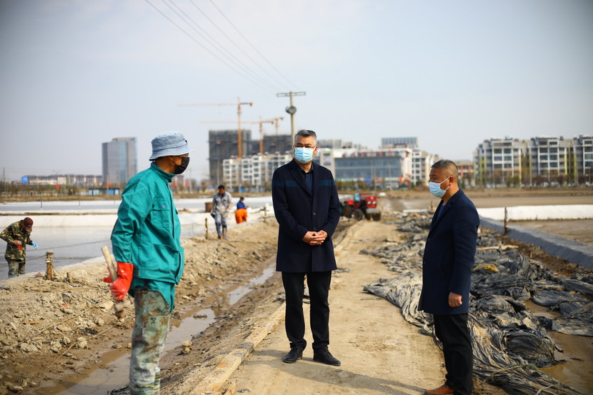 第一站來到海州灣公司昌圩班組。該班組41日礦鹵灌池,目前第四塊結晶池正在進鹵,該公司三大組長帶著各自隊伍都來支援,一起給新灌結晶池更換新塑苫布,大家忙的不亦樂乎。王董事長首先慰問大家,新冠疫情暴發(fā)以來,海州灣公司廣大員工克服困難,一邊強化疫情防控,一邊加班加點抓生產,雖然有的工作耽誤了,但是礦鹵灌池工作仍然趕在天時轉好之前進行了。昨天進鹵的結晶池底已經鋪上了一層鹽,看起來甚是喜人。昌圩班組負責人,老先進老黨員朱春年同志看到王董事長來檢查工作,他也非常高興,和海州灣公司負責人劉天義一同聚攏過來,與董事長攀談,匯報工作。最后王董事長強調,一定要抓緊灌池,抓緊更換新塑苫布,打好“礦鹵復產”戰(zhàn),我們基礎產業(yè)牢固了,臺北的發(fā)展也就穩(wěn)固了。同時,也不要忘記抓好疫情防控工作,職工集體工作時要保持一米線距離,保證不扎堆。劉天義、朱春年代表職工表態(tài),一定按照投資公司有關布置抓好各方面工作,一定拼命干,加油干,爭當虎將打頭陣,當好“臺北保衛(wèi)戰(zhàn)”主攻隊。