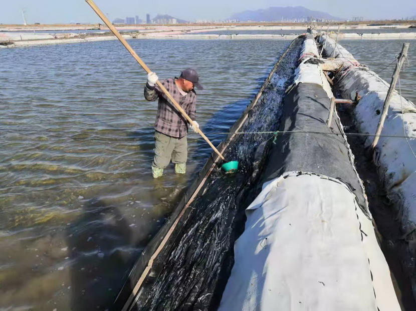 2021年,他服從公司生產(chǎn)機(jī)制的轉(zhuǎn)換,被安排到海濱三組18號灘作為領(lǐng)灘手,負(fù)責(zé)鈣液生產(chǎn)。為了不浪費(fèi)每一毫米的蒸發(fā)量,每天天剛蒙蒙亮,就能看見他在縱橫阡陌的鹽田間穿梭,根據(jù)灘田結(jié)構(gòu)、針對不同季節(jié)確定走水路線,每天重復(fù)著調(diào)節(jié)鈣液、修整溝堰、修補(bǔ)塑布的工作,遇到大雨,他就不回家,守在灘上,及時把鈣液按照不同濃度引進(jìn)鹵臺、鹵窖,雨水結(jié)束,第一時間把灘面淡水排掉,將鈣液回引進(jìn)行晾曬。在生產(chǎn)面積僅有311畝的情況下,他每天要走3-4萬步,不僅對他自己的生產(chǎn)單元,對整片鈣液生產(chǎn)單元了如指掌,有多少閘門,多少電線桿,都了然于心。全年下來,生產(chǎn)鈣液28000方,在12個鈣液生產(chǎn)單元中名列前茅,領(lǐng)先超9000方,實(shí)至名歸的生產(chǎn)標(biāo)兵。