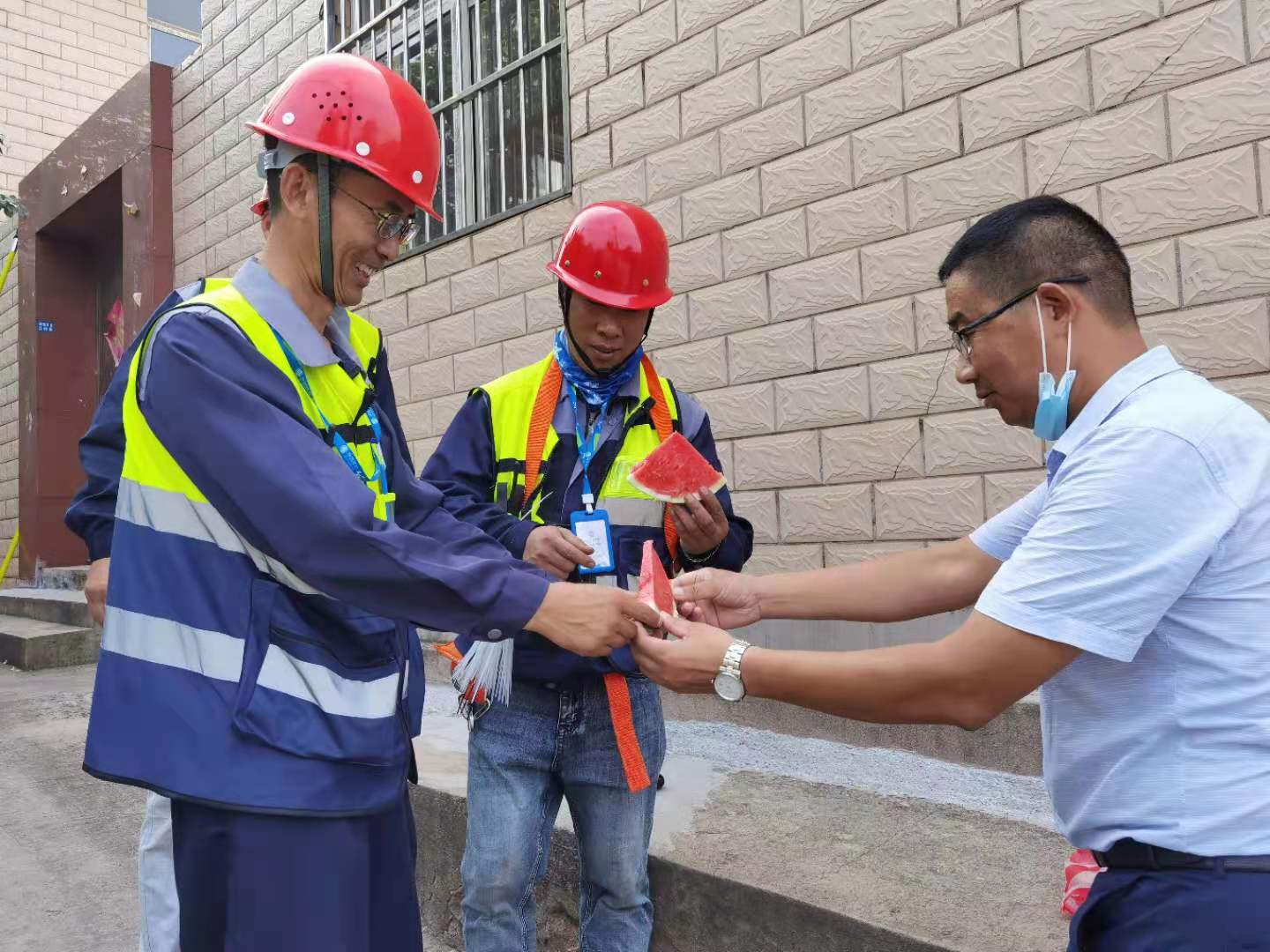 8月19日下午,翔立分公司工會為奮戰(zhàn)在移動線纜整理第一線的職工送去西瓜,為他們帶來組織的關(guān)懷,在炎炎夏日送上絲絲涼意。為完成今年下達的目標(biāo)經(jīng)營任務(wù),通信各小分隊的成員不懼高溫“烤驗”,全力以赴堅守在工作第一線。路邊瓜香彌漫,讓這個夏天不再炎熱。